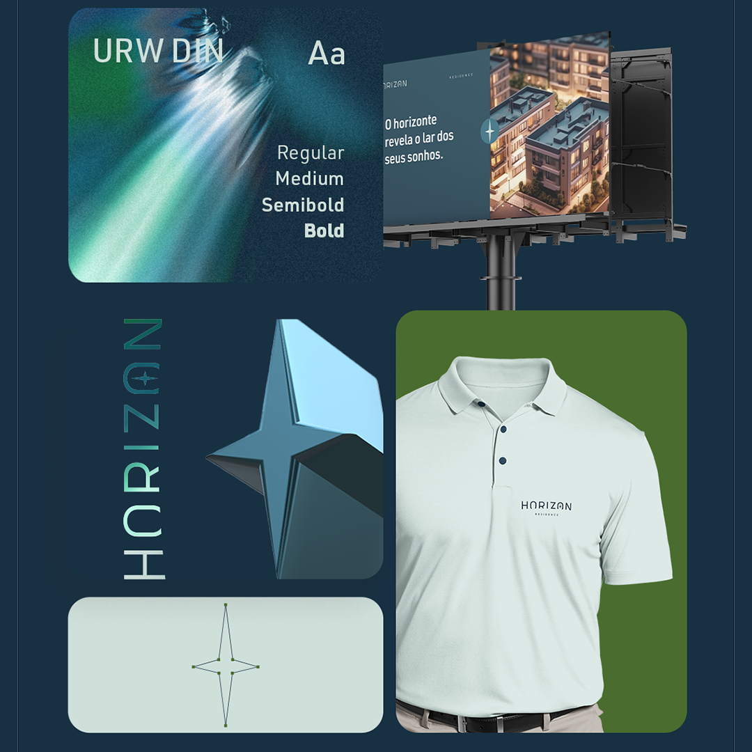 A identidade visual valoriza a perspectiva de um horizonte promissor, com traços elegantes e uma paleta de cores que inspira confiança e inovação. O resultado é uma imagem memorável, alinhada ao alto padrão do empreendimento e ao estilo de vida que ele proporciona.